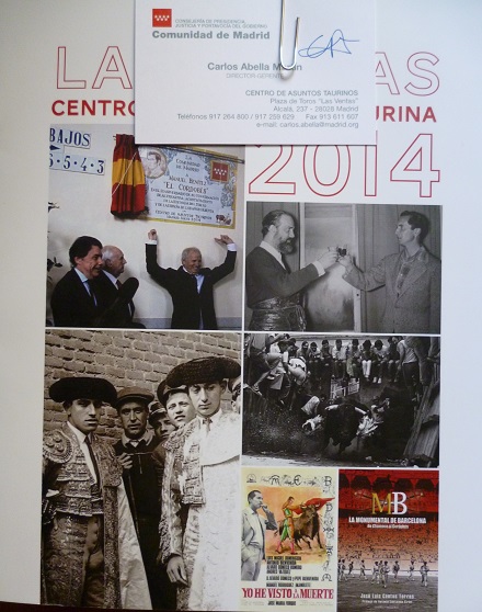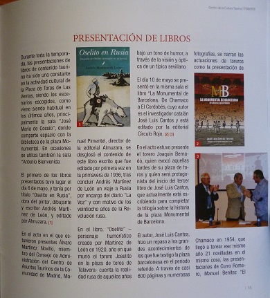 En la revista informativa del Centro de la Cultura Taurina de las Ventas (Madrid), se recogen los diferentes actos realizados a lo largo de 2014, entre ellos la presentación del 2º tomo biográfico de La Monumental de Barcelona. Todo un privilegio que agradezco a don Carlos Abella, Director-Gerente del Centro de Asuntos Taurino de la Comunidad, al maravilloso equipo que dirige y al maestro Joaquín Bernadó por quererme acompañar en una cita tan importante para mí.